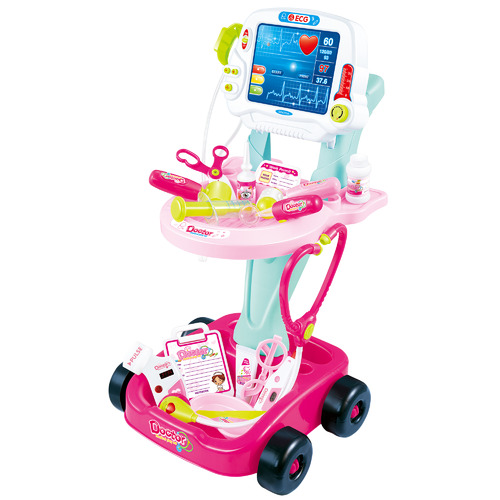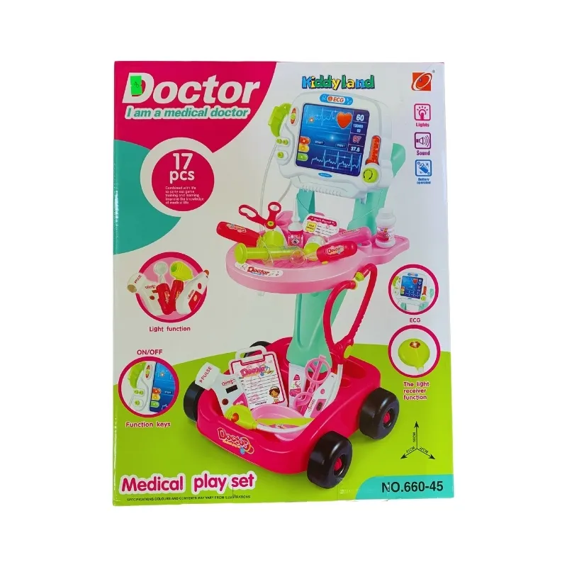El set incluye 17 accesorios y un cochecito para poder desplazarse con todos los instrumentos médicos. COMPOSICIÓN DEL CONJUNTO: • Un estetoscopio que reproduce el sonido de un latido del corazón e ilumina el corazón cuando se toca • el espejo dental retroiluminado • Lámpara de oído y nariz para el paciente • Termómetro con resultado iluminado – Control de temperatura • Jeringa • Medidor de presión arterial juguete •gafas • 2 x tijeras • Una tarjeta de identificación para pino • Imitación de gotas para los ojos • Imitación de líquido para desinfección manual